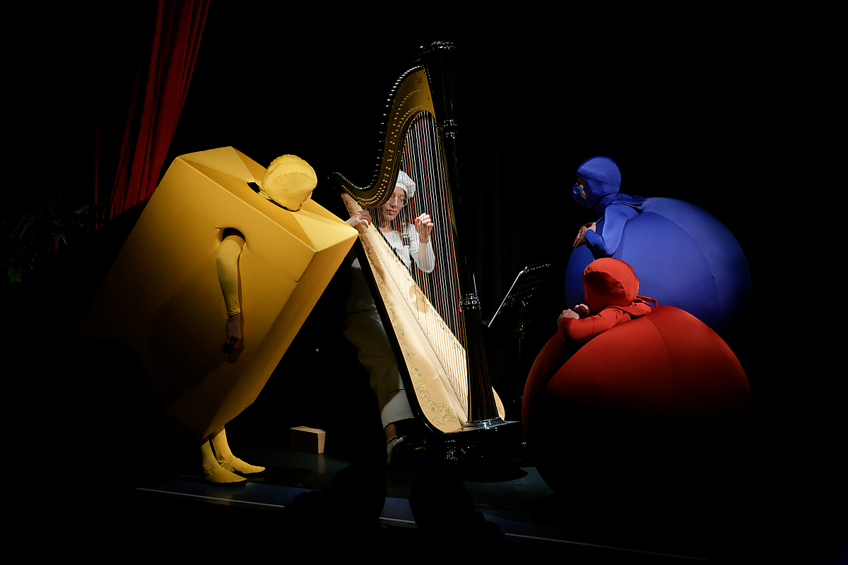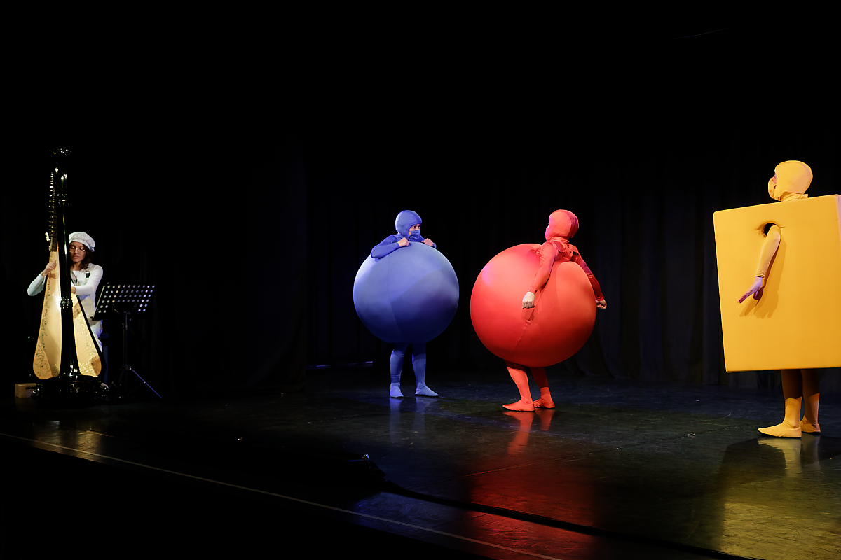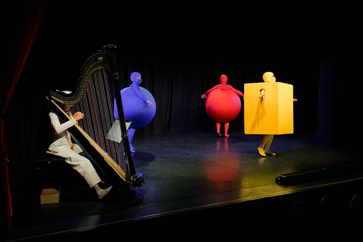 Sur une composition parfois improvisée, une harpiste accompagne merveilleusement la représentation des différents stades de l’apprentissage d’un tout-petit : apparaît d’abord une sphère rouge qui s’éveille et découvre son corps, puis un cube jaune qui s’entraîne à la marche et, enfin, une sphère bleue qui effectue quelques pas de danse et cherche un ami.
