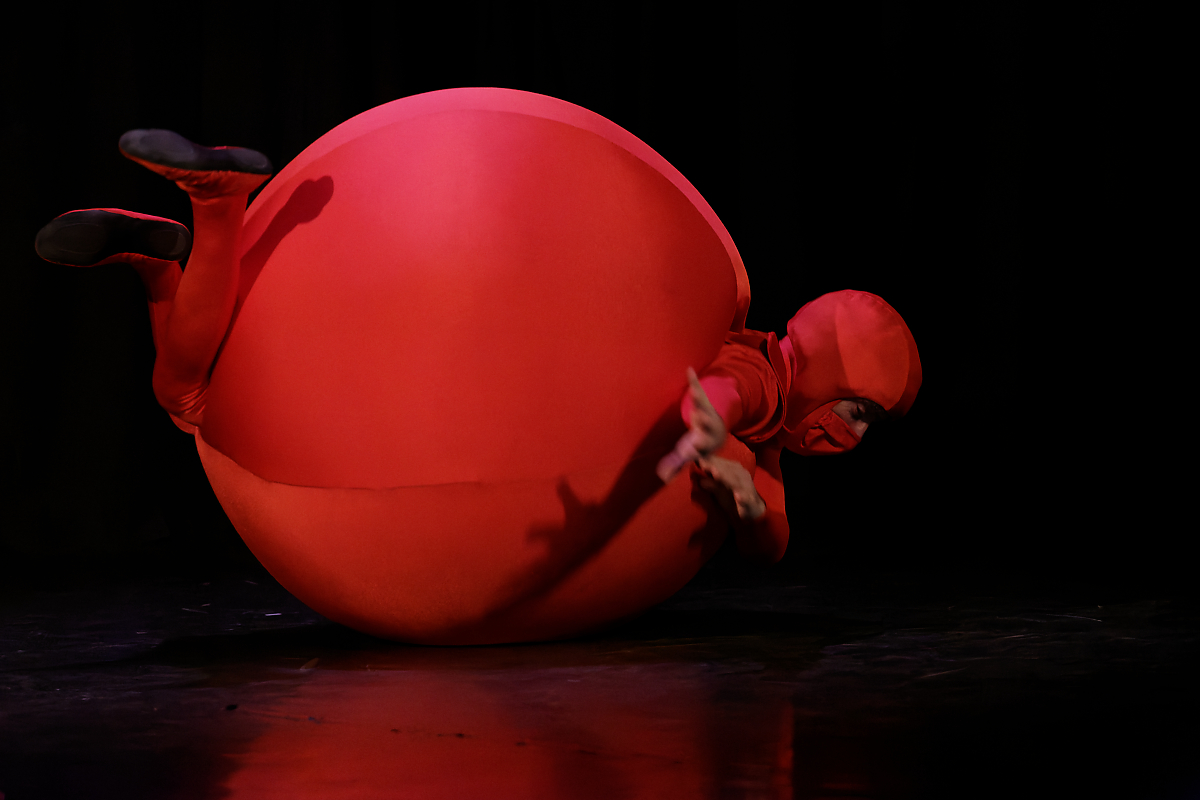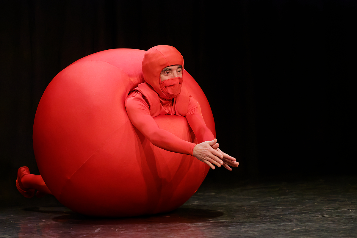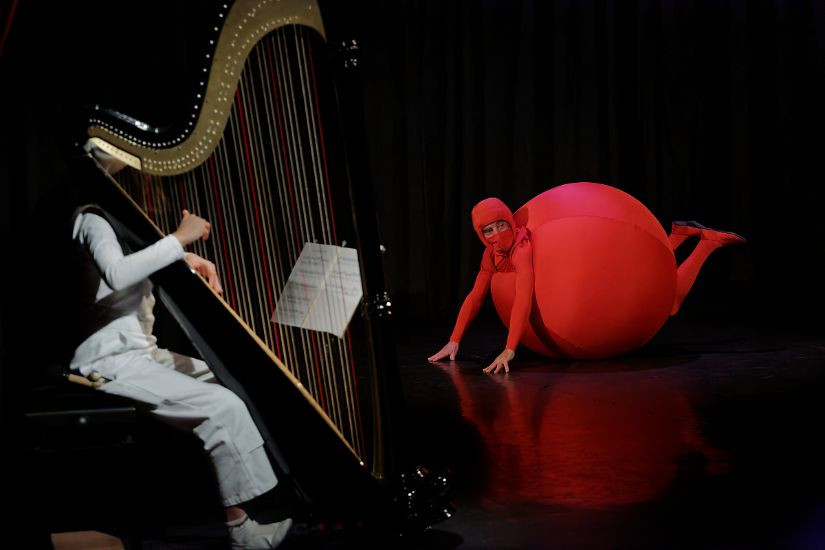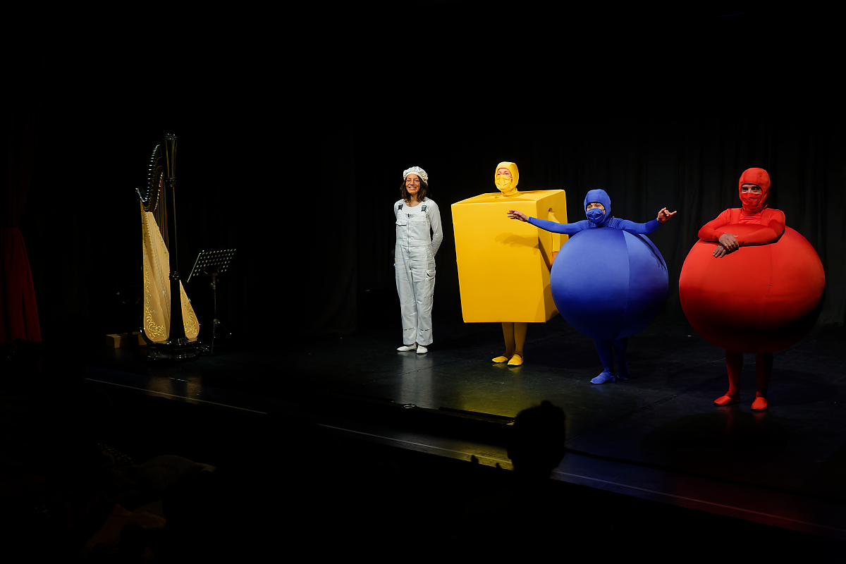 Sur une composition parfois improvisée, une harpiste accompagne merveilleusement la représentation des différents stades de l’apprentissage d’un tout-petit : apparaît d’abord une sphère rouge qui s’éveille et découvre son corps, puis un cube jaune qui s’entraîne à la marche et, enfin, une sphère bleue qui effectue quelques pas de danse et cherche un ami.